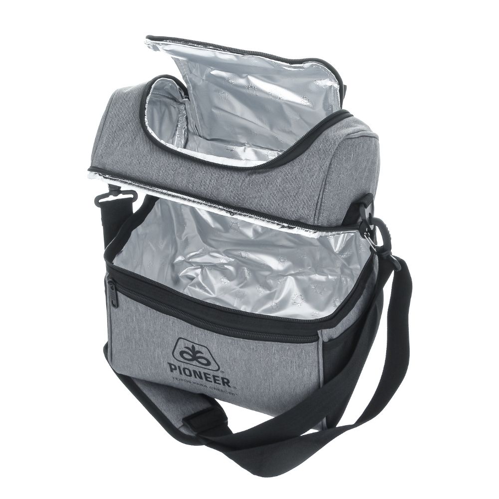 Bolsa térmica dupla de nylon com três compartimentos, capacidade de 16 litros. Contém dois compartimentos térmicos isolados, sendo o principal com costura soldada (não vaza). A bolsa possui alça de mão com pegador plástico, bolsos laterais em malha e acompanha alça transversal.