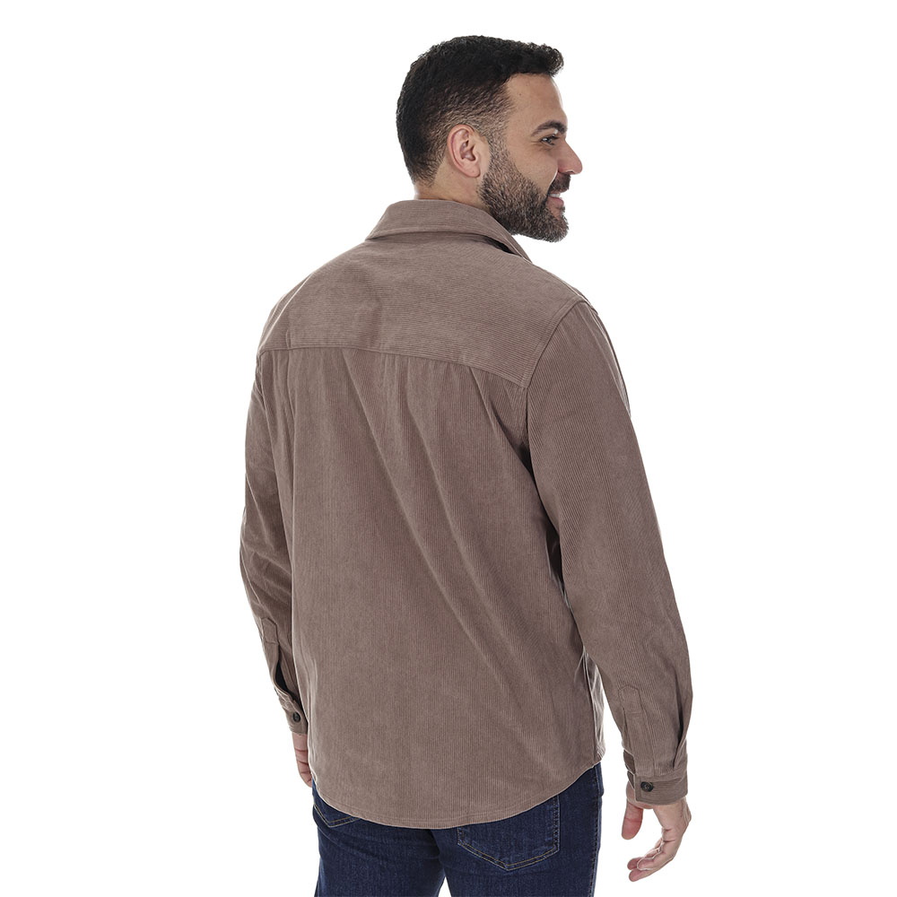 Jaqueta confeccionada em veludo cotelê com modelagem overshirt, cor marrom transitando entre camisa e jaqueta. Possui bolso único frontal, gola colarinho e fecho em botões frontais.